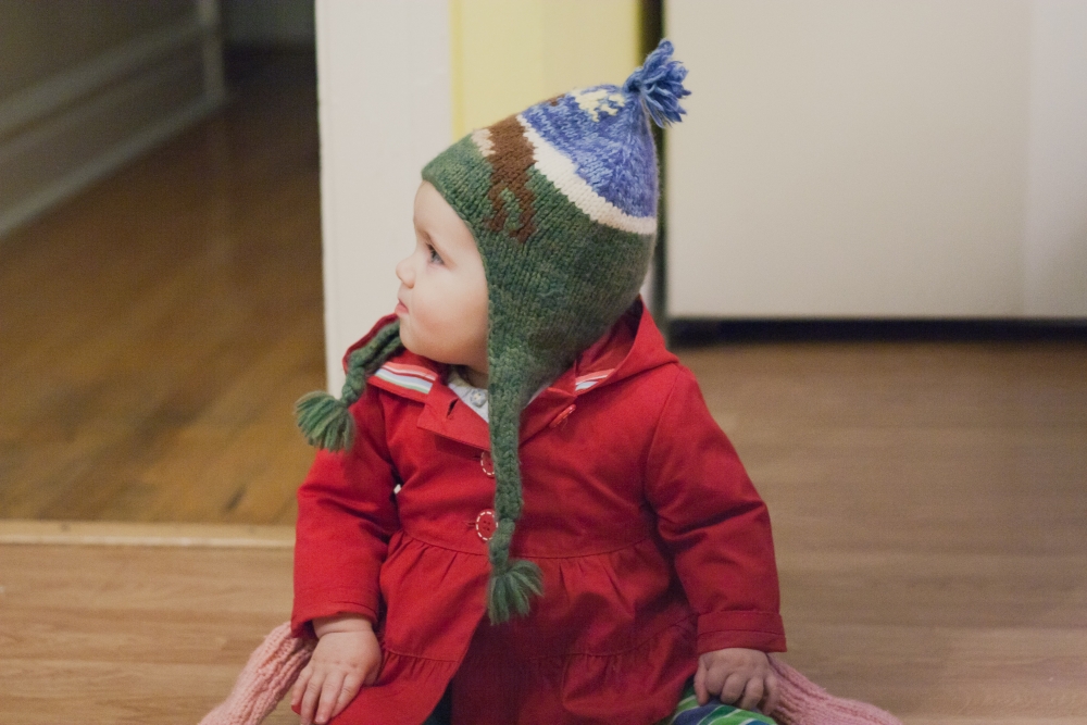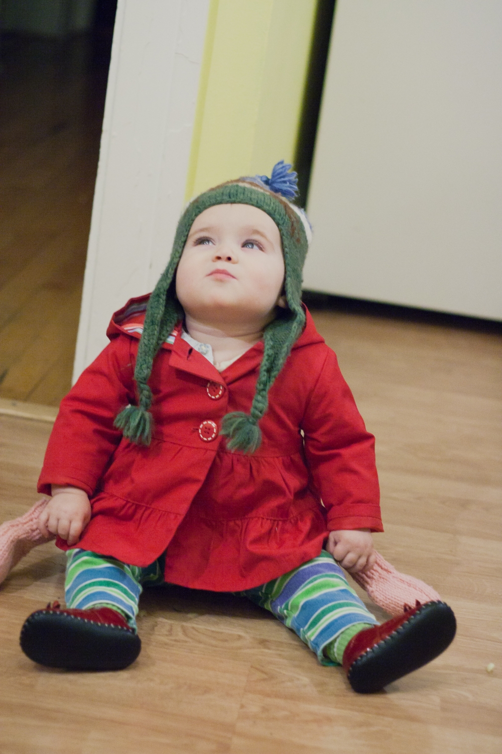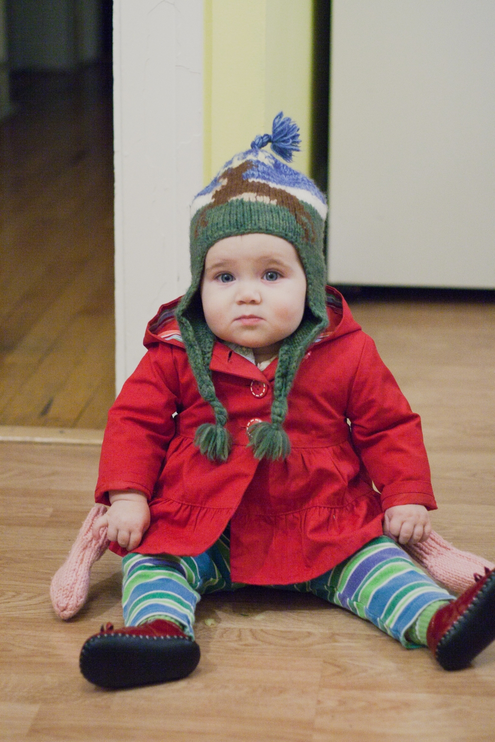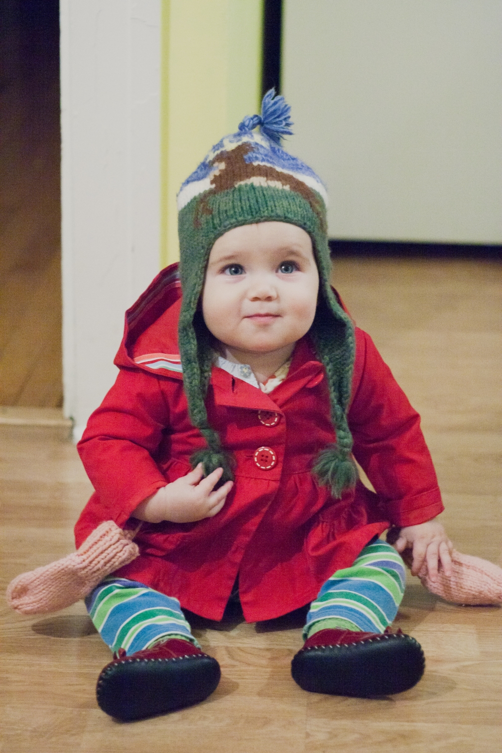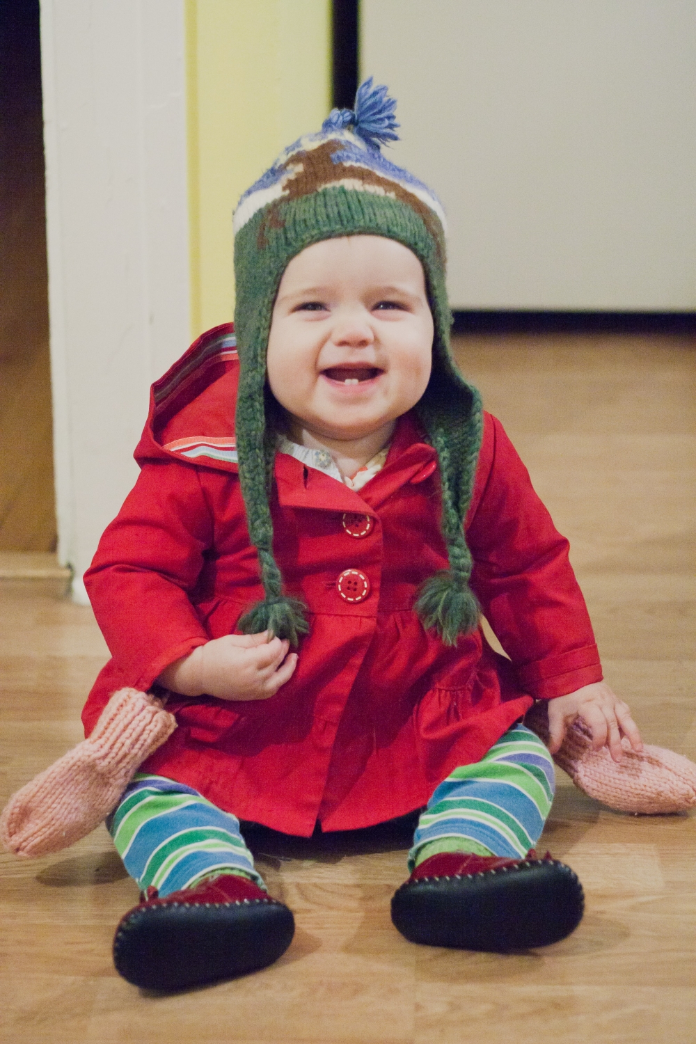 In six days Scoopy (or Scoops, as we have taken to calling her - I don't know, this girl has a lot of nicknames and they don't all make sense. Past nicknames include but are not limited to: Glowworm, Glow, Indiglow, Bug and Indy-Bug) will be 10 months old! Sheesh! This year is going by way too fast. I can't believe I'll be planning her first birthday party soon. Also, cool weather equals baby cuteness! Who can resist a bundled up baby?!