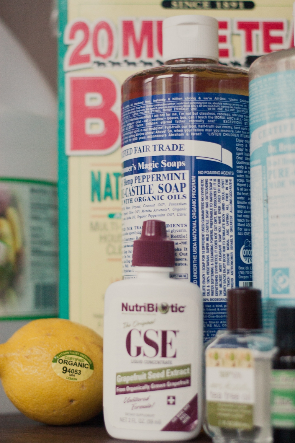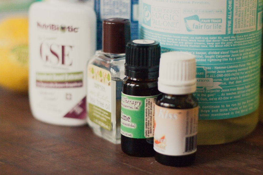- 1 teaspoon liquid castile soap (I love Dr. Bronners. It can seem expensive but it is concentrated and a little goes a long way. I have peppermint and baby mild [which is unscented], but there are several scents, so pick your poison. Just keep in mind how the smell might mesh with the other essential oils in the recipe)