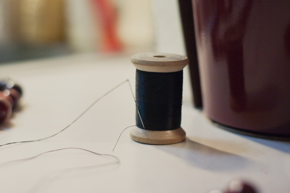 Thread your needle and pull out a double length of thread at arms length apart. Attach a seed bead at the end to keep the cranberries on, and string away, finishing off with another seed bead. I find a thimble helpful when pushing the needle through, but you can also press the eye of the needle against the table or another hard surface.