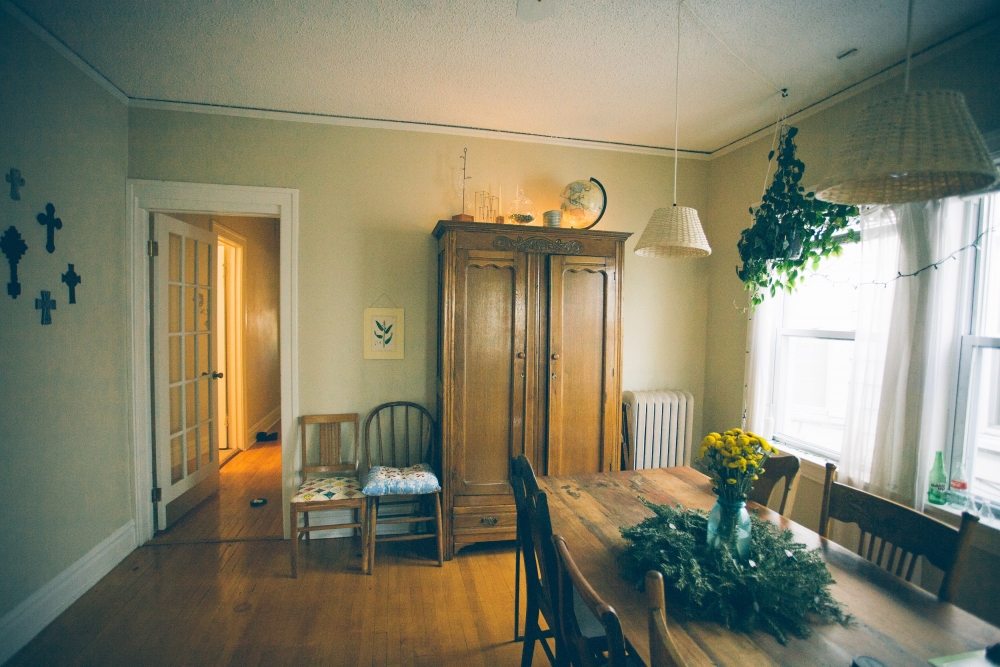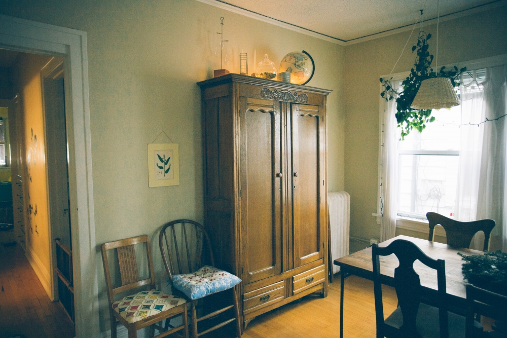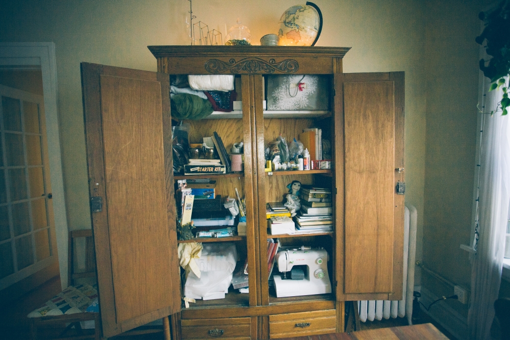 We found it for a very fair price at Jubilee Furniture, an antique cupboard which is very solid and has been beautifully refinished. It ended up being a perfect fit for our space, and I think it's improved the overall look of the room. It houses all of our supplies, and even though I no longer have my own designated sewing table, I think upon opening the doors it turns the whole diningroom (the center of the house) into a creative space and in that way fosters creativity.