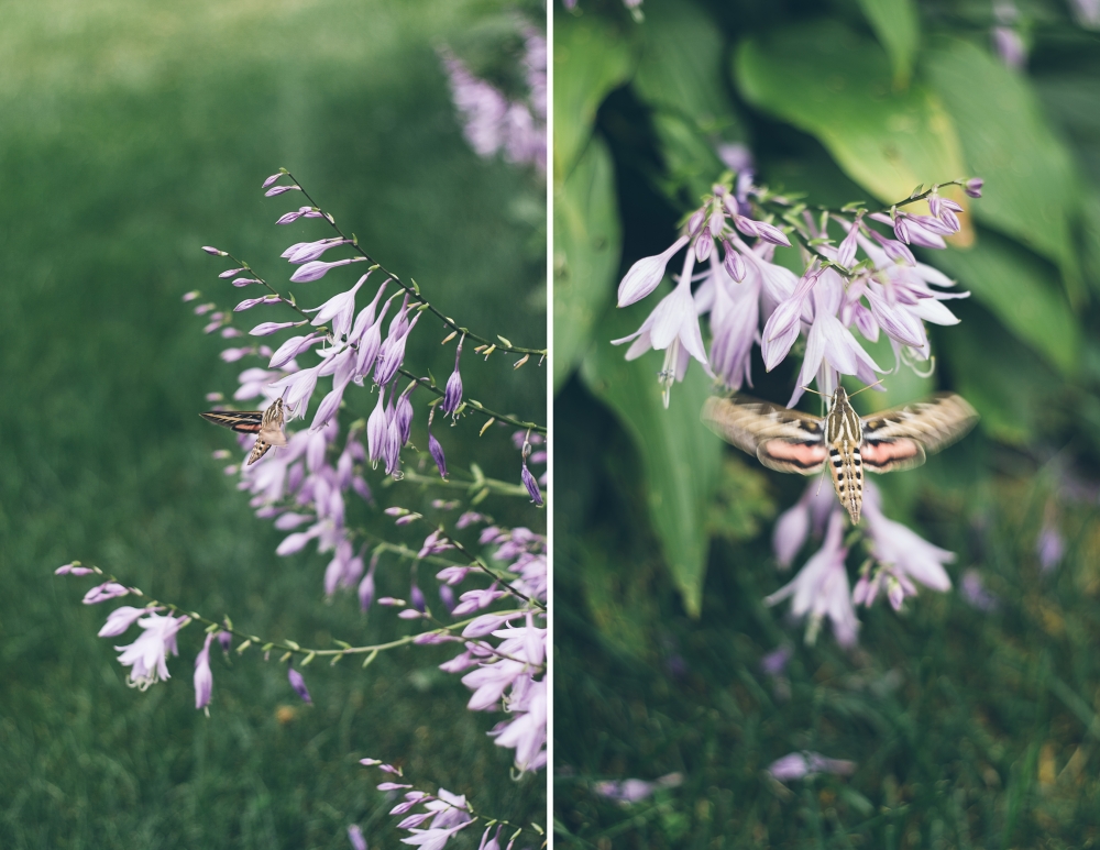 Just the other day another blogger posted a picture of one of these moths, saying she had never seen it before and it reminded her of a cross between a hummingbird and a moth. Then I spotted one in our own yard, fluttering amongst the hosta blossoms, hovering and beating its wings rapidly just like a hummingbird! Turns out her description was apropos, considering this is the white-lined sphinx hummingbird moth. I called Alan out to look at it, and was saying to him how if we were still living in the apartment we just wouldn't have had an opportunity to see something like this, and it made me grateful all over again for a yard and flowers and the opportunity to spot something like a hummingbird moth right in my backyard.