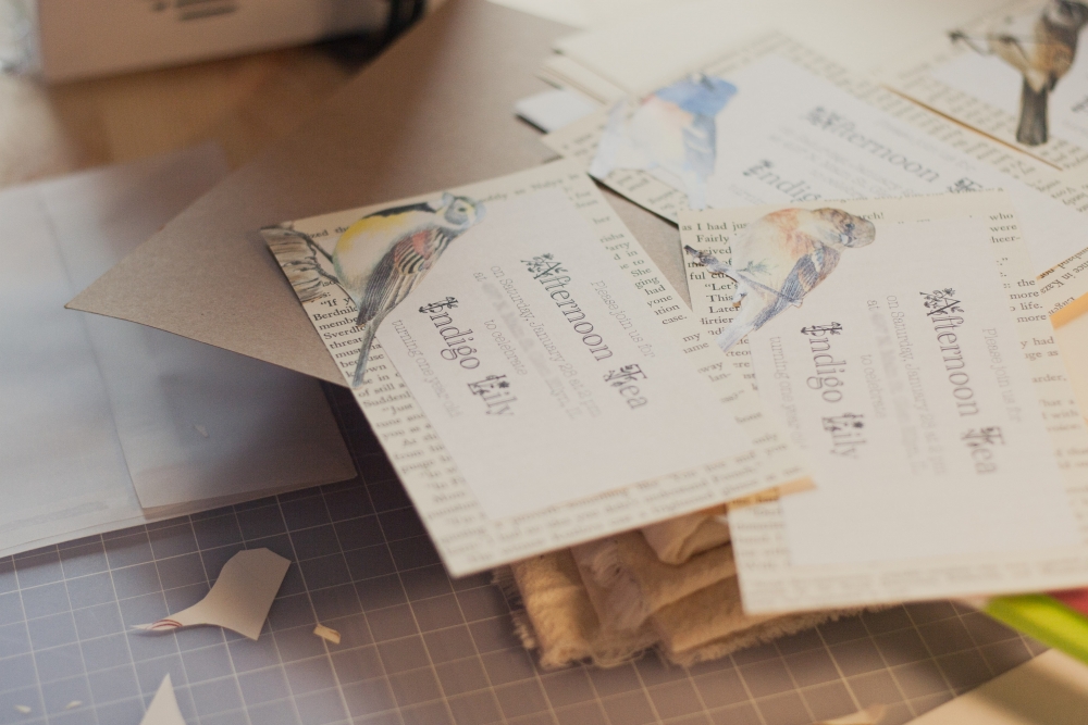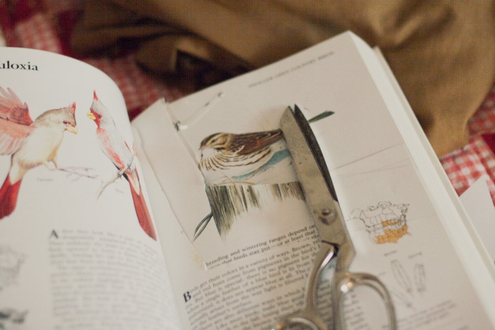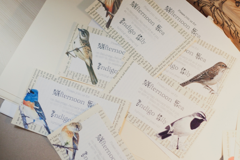 I finally got the invitations for Indy's birthday done! (I am having so much fun planning this party, we settled on a little afternoon tea time theme!) I had the idea for the invitations in my head, and I asked Alan what he thought the chances were of finding an old Audubon-type book at the thrift store. I was sort of skeptical, but within 30 second of being there on Saturday he was holding a "Birds of North America" book in front of my face, haha. What luck! I grabbed another vintage book so that I could use the pages. Sorry, books. . .