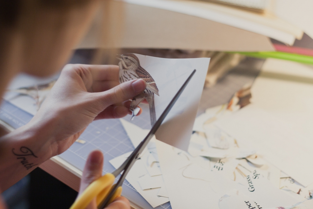 I cut out various birds by hand (the most tedious part) and attached them with quick dry glue.