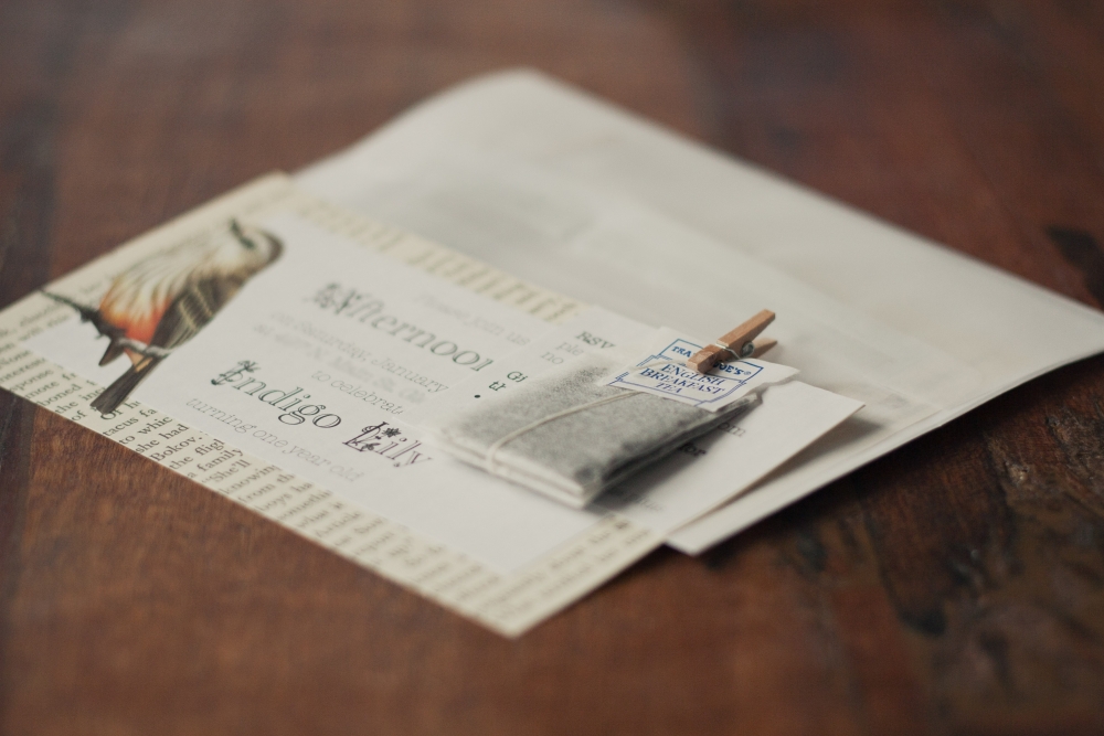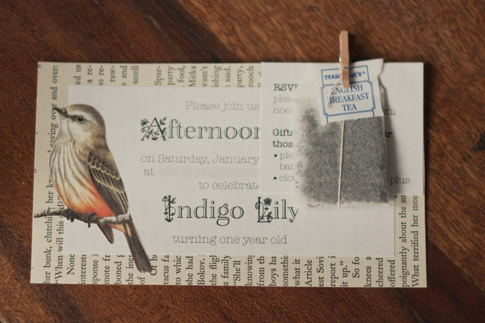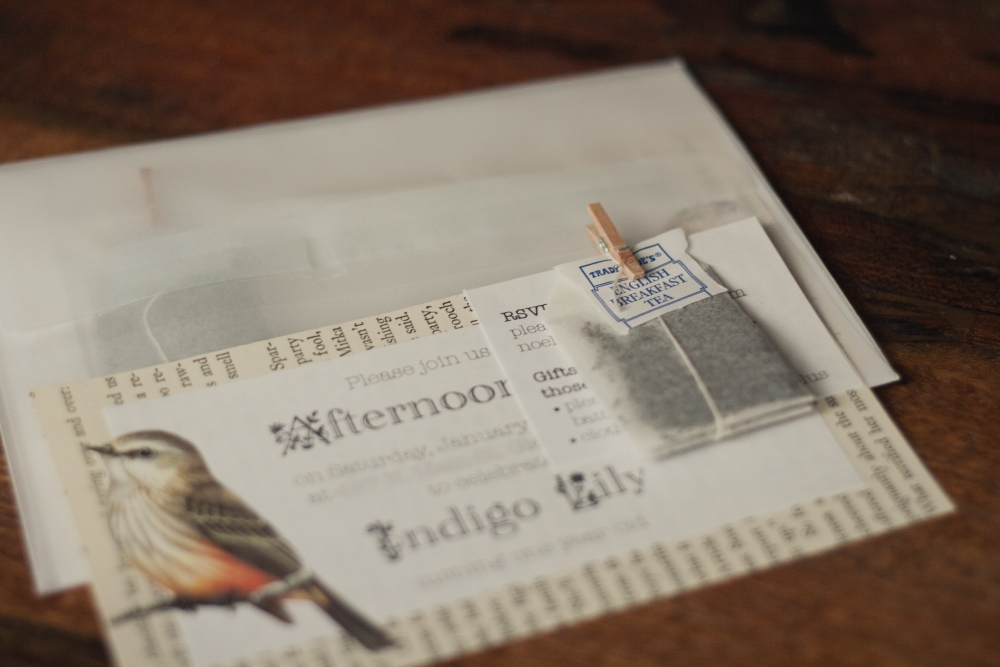 Meanwhile I finished the invitations off by attaching RSVP/gift info and a bag of tea onto each invite with these adorable tiny wood clothespins I had, and used up the rest of the vellum envelopes I had leftover from our wedding invitations. . .