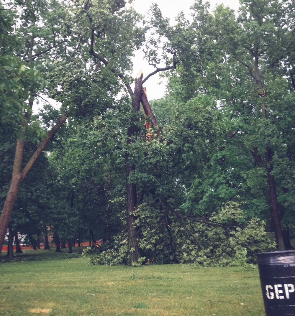 And this one was ripped out by its roots, along with a nice 15 foot chunk of earth, and their pretty park bench is still perched there by the trunk.