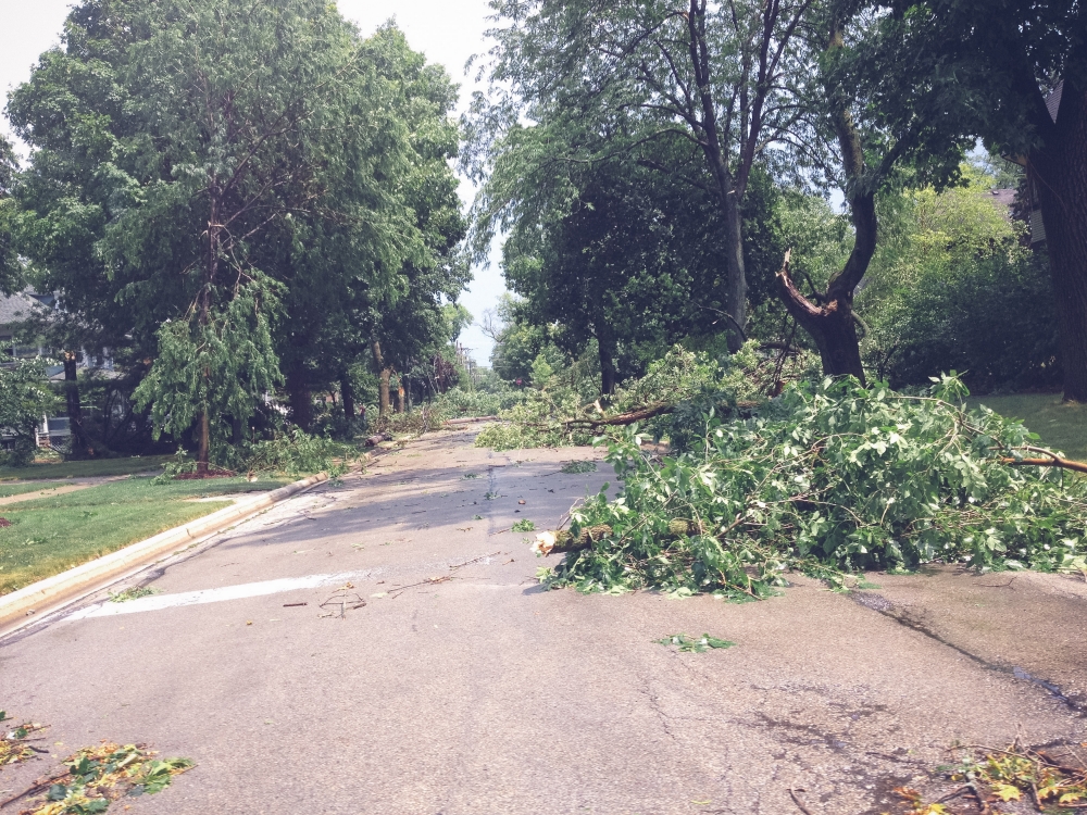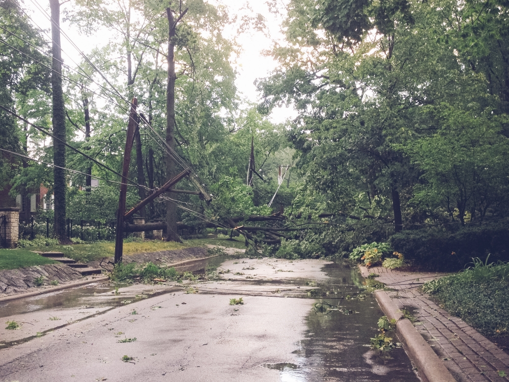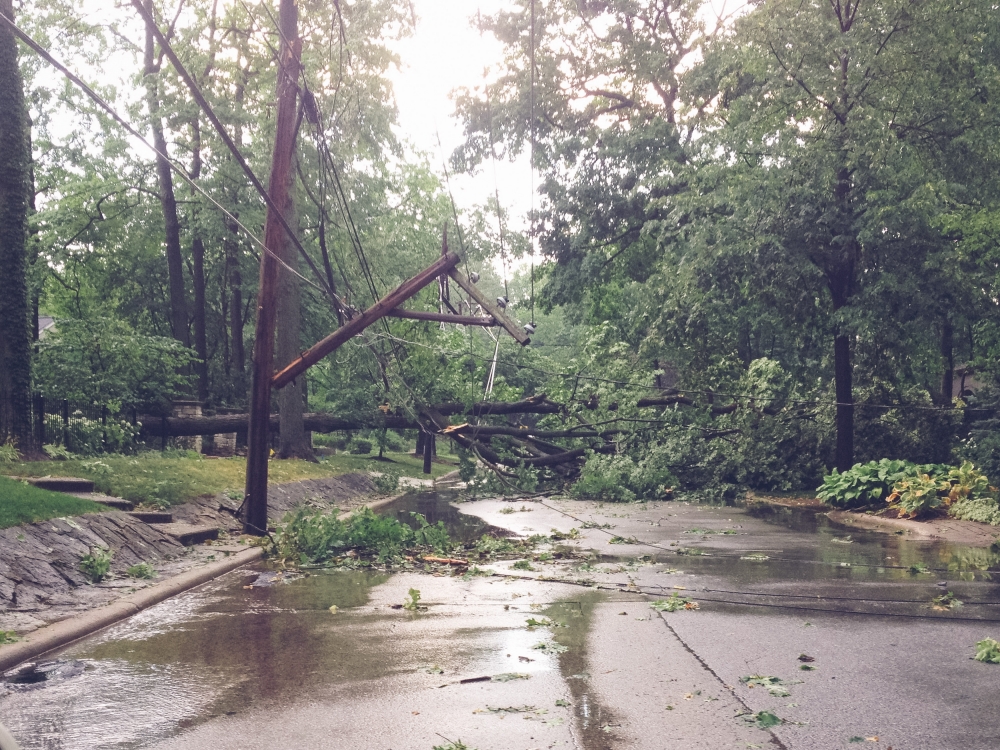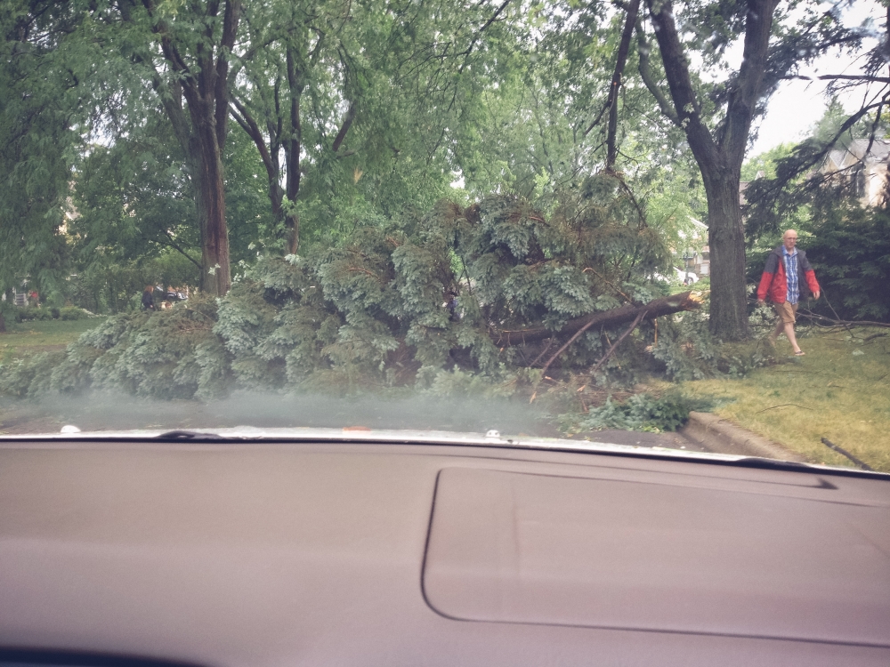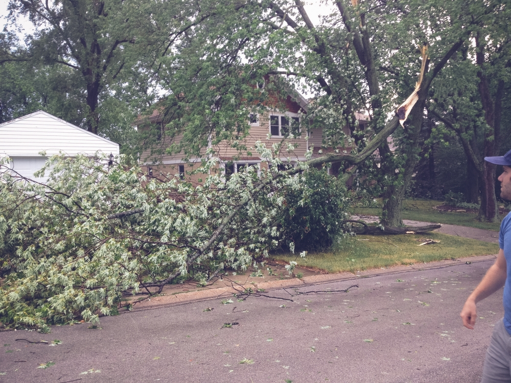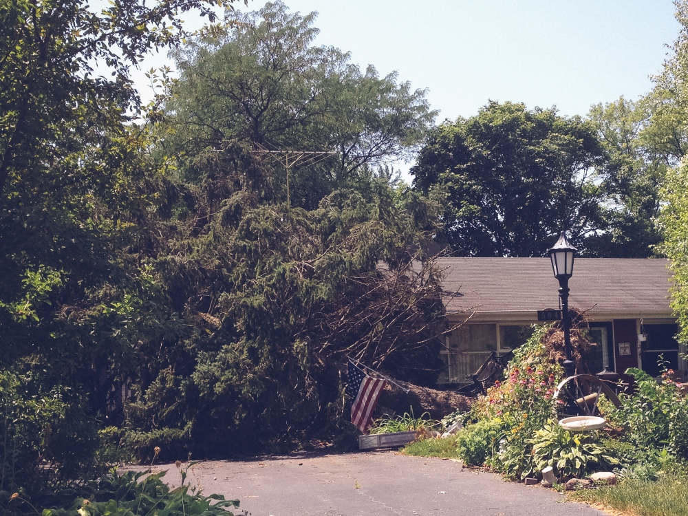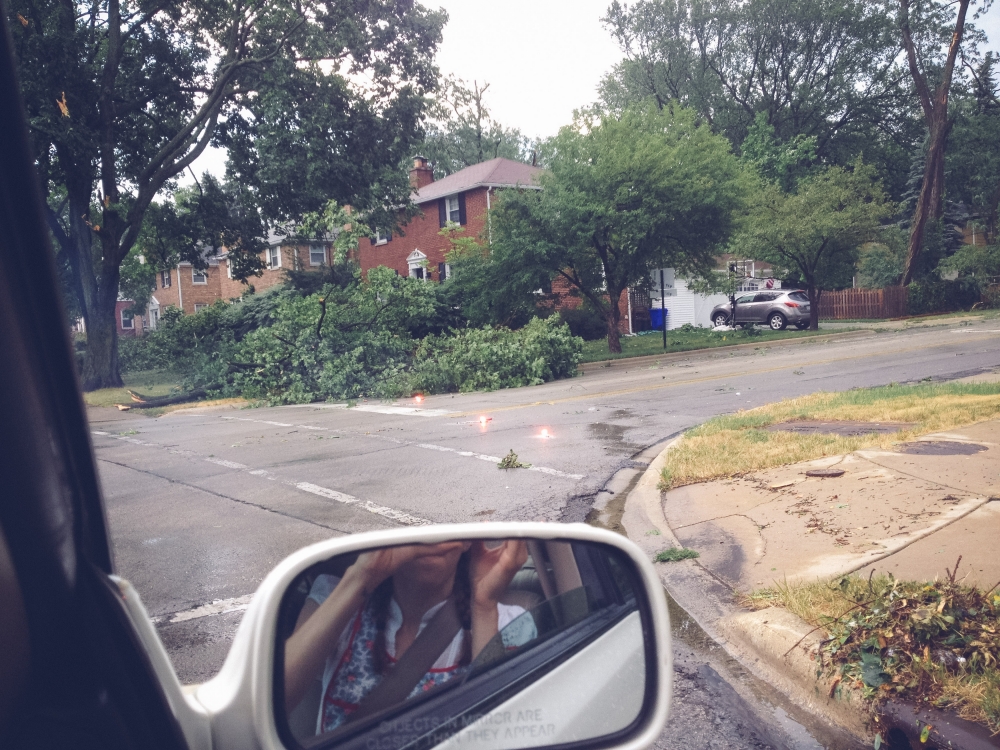 Ok so I can't totally blame one silly (not-so-silly) storm for me being gone from this space for something like 11 days, but it made for a sort of hectic start to last week which then ran into a whirlwind long weekend roadtrip to Philadelphia for our friend Ellie's wedding (pictures from that trip coming soon). The storm hit the Sunday before last just as church was letting out, which kept us trapped inside the building for a good 20 minutes until the worst of it had passed. Indy must have had some sixth baby sense about it, since every time I went anywhere near the door she shrieked and hugged my neck and smothered me in terrified kisses even though she couldn't even really see outside. When we finally made it to our car, it was obvious that some sort of micro-burst had come through; it was easily the worst storm I can ever remember seeing. Trees and telephone poles were snapped in half like toothpicks, and power lines were down everywhere. We didn't get power back until early the following Tuesday morning, and Joel and Kate didn't get their power back until late Wednesday night. For others it took much longer. Of course, this all happened to coincide with an intense heat snap with temperatures in the 90's and all the way up to 100. We lit all the candles we had and toughed it out the first night (if Alan running out at 2 a.m. to get a marine battery to hook up to a box fan still counts as toughing it out), stayed at my parents the following night, and then everyone stayed at our house Tuesday night to escape the heat.