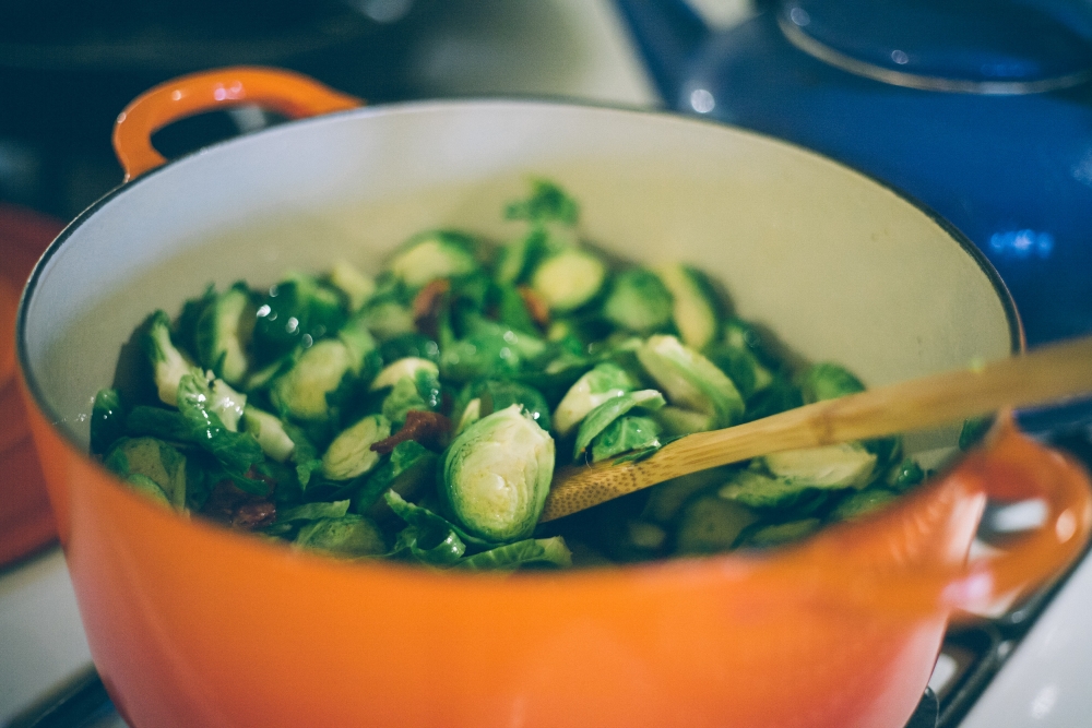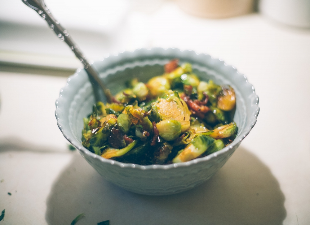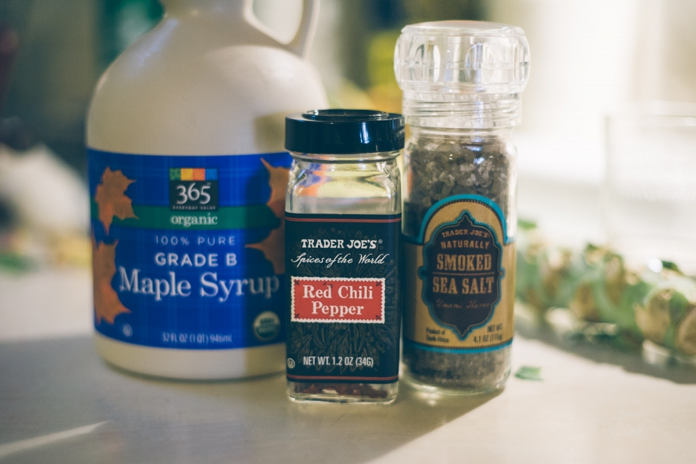 Meanwhile, wash and thinly slice brussel sprouts. Once the bacon is crispy, add onion and cook until translucent, then add the sprouts, red pepper flakes and syrup. Cook uncovered until very tender and caramelized, stirring occasionally. Then add the smoked salt to taste.