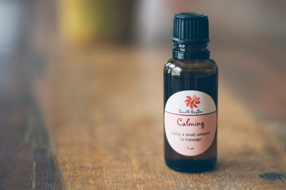 Carla sent me a bottle of her "Calming" blend to try for myself: soothing lavendar in a base of her own Bumble Carrier Oil Blend (Fractionated Coconut Oil, Grapeseed Oil, Organic Sunflower Oil, Sweet Almond Oil, Extra Virgin Olive Oil, Organic Sesame Oil, Wheatgerm Oil). If Indy is having a restless evening, I incorporate the Calming oil into her bedtime routine by massaging a small amount of it onto her feet and pulse points (the various oil blends have directions for use specific to their various purposes, but lavendar makes a great general massage oil and could simply be rubbed on baby's back as well). The combination of massage and the calming properties of lavendar help her settle into bed and sleep more peacefully.