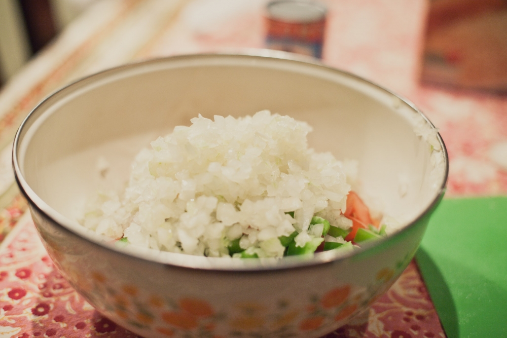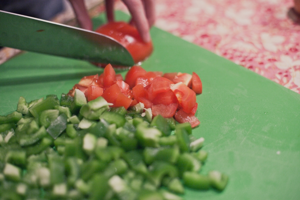 Start buy chopping the pepper, onions, tomatoes, and mincing the garlic. . .