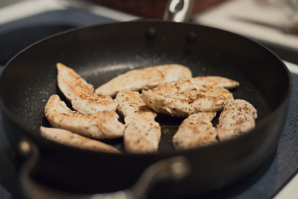 Heat up oil in a skillet over medium heat, season chicken with salt and pepper, and cook thoroughly. . .