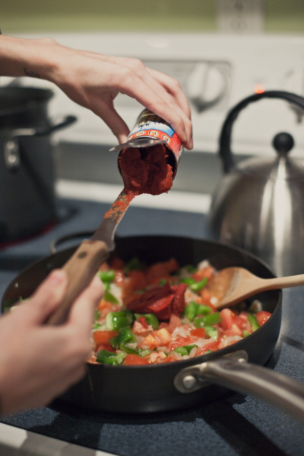 Transfer chicken to a plate and add fresh ingredients and tomato paste to the skillet. Mix and cover, stirring often to prevent sticking. . .