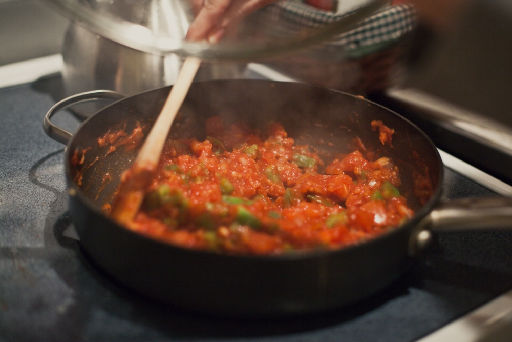 Add salt and pepper to the tomato mixture (it should be getting nice and stew-y). . .