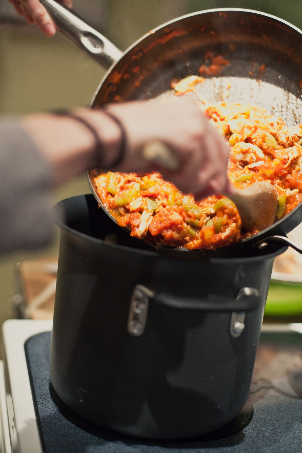 Once the peppers are soft and everything is cooked down, add the chicken, mix, kill the heat and re-cover. . .