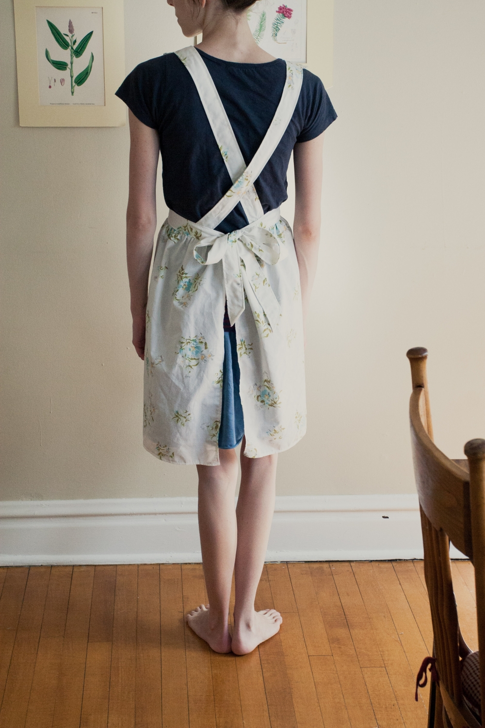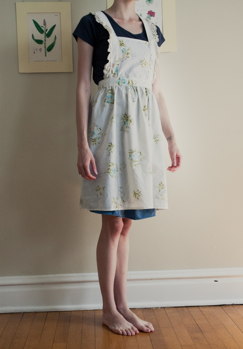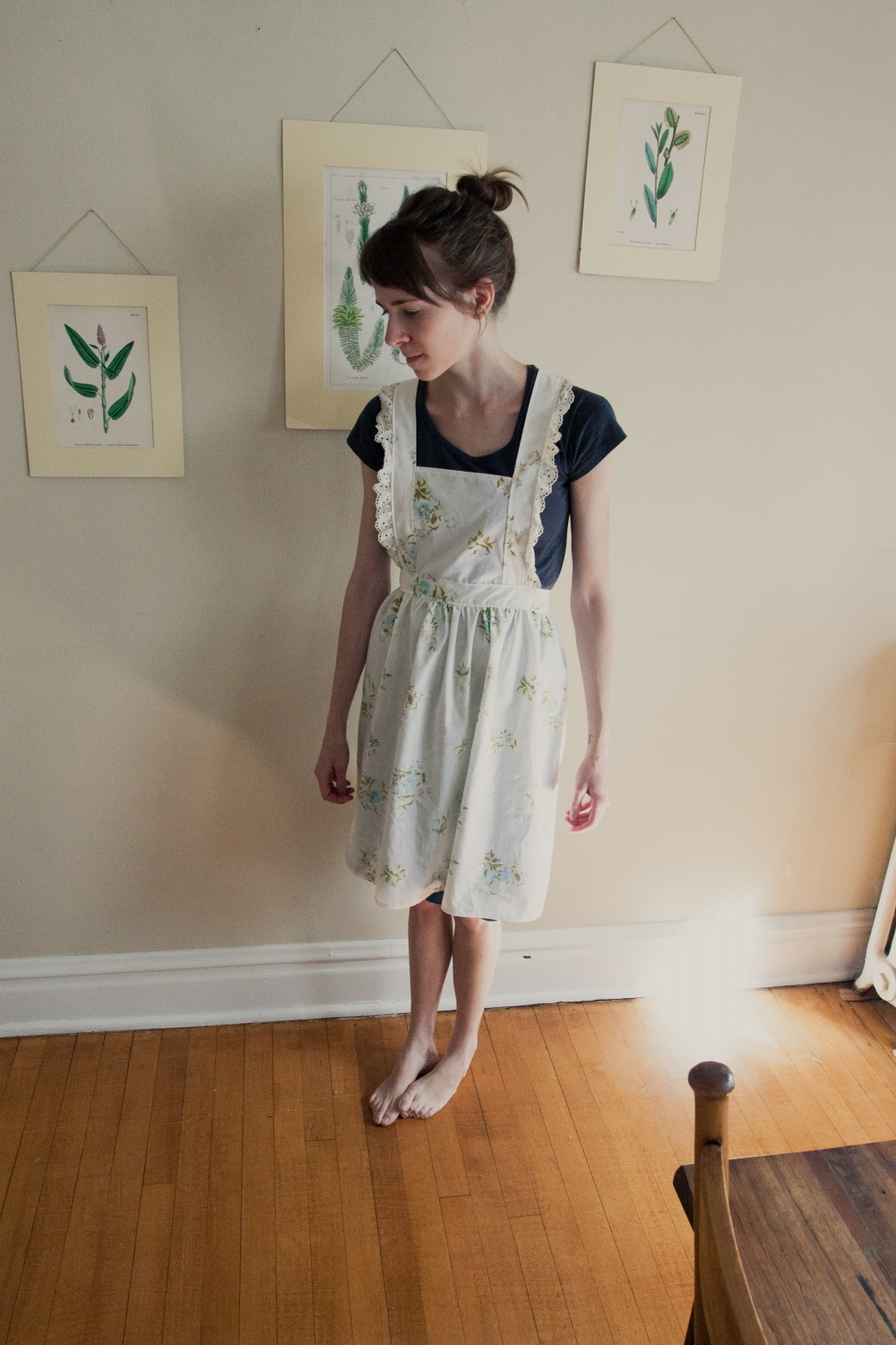 Anyways, I could go on, but for now I'll talk about what a logical girl does when daydreaming about chickens and knowing they're still several years off: redirect that energy into the hunt for farmy clothes. I've decided now's the time to start compiling a wardrobe that jives with my daydreams. Do you know how hard it is to find clothes that speak of early summer mornings in the kitchen and with a skirt worthy of piling vine-fresh tomatoes into? They don't really exist. So I decided I might as well make some things myself. First in this vein: the pinafore apron dress.
