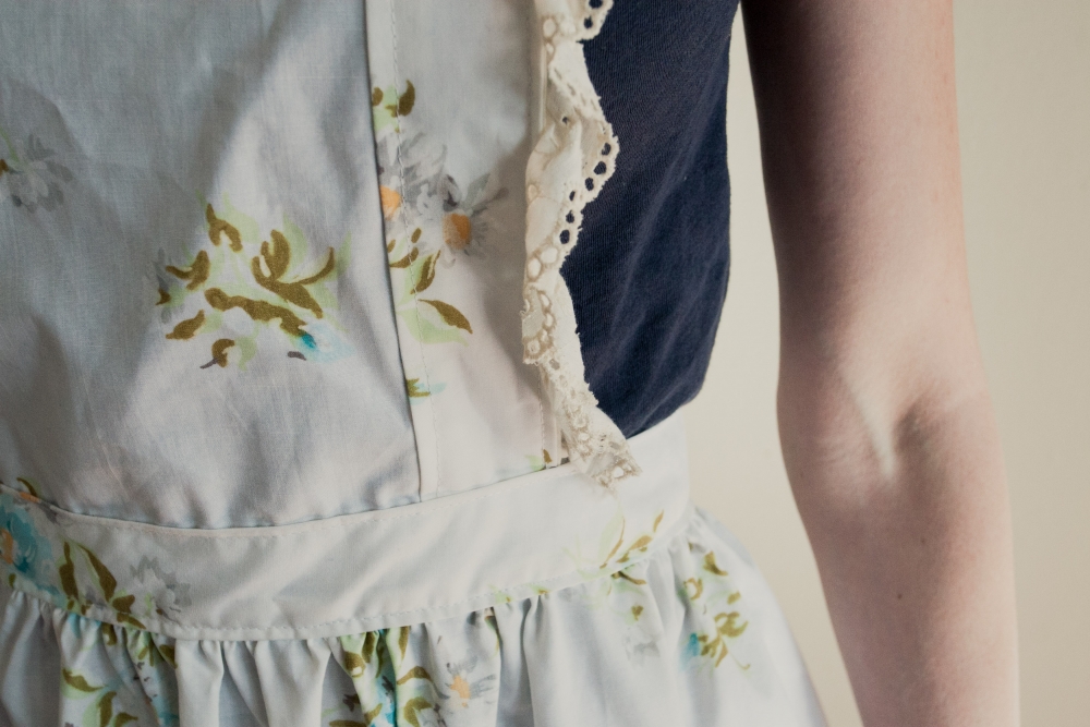 It's open in the back, so its made for layering. I used a vintage sheet from the thrift store, and some leftover lacey ruffle-stuff for the edging on the straps. I made the straps buttonable and therefore adjustable, and obviously the sash tie makes it adjustable as well. It was super easy, since all of the peices are simply rectangles of some sort, so no fancy cutting. I'd gladly offer instructions sometime, if anyone is ever interested.