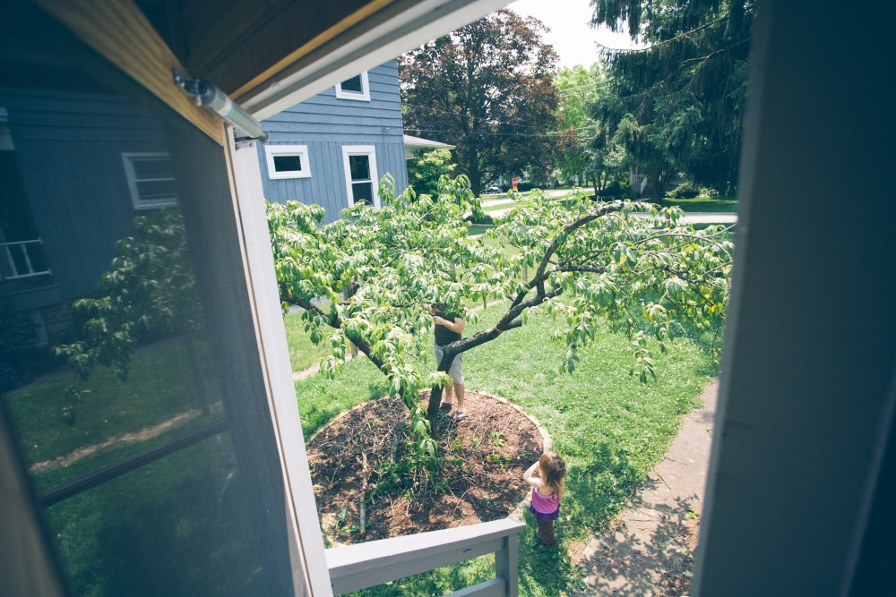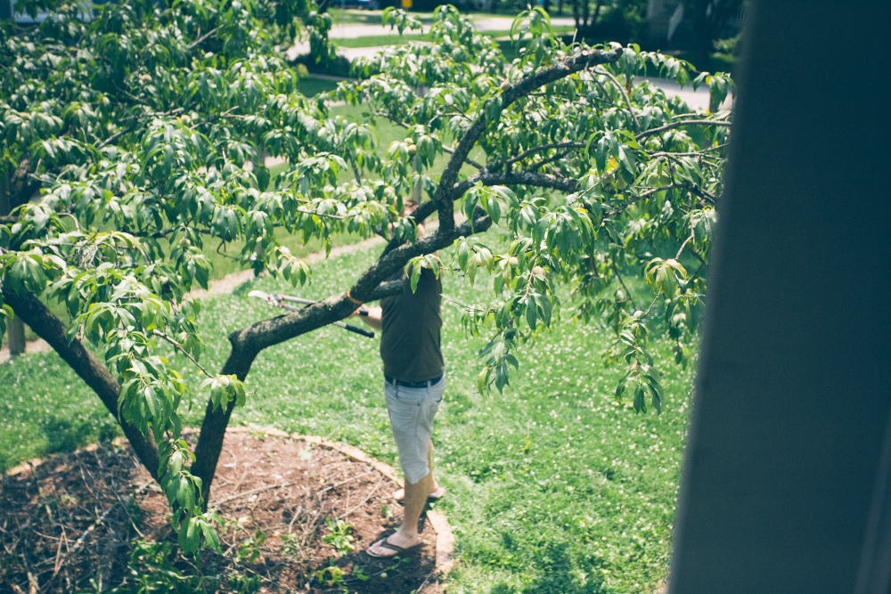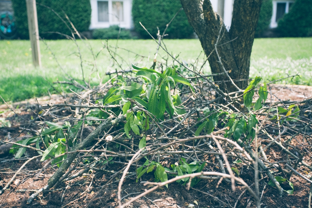 After doing a bit of research on peach tree care, we spent the other morning pruning the neglected peach tree. The previous owner told me that the tree is producing, and that she made a cobbler last year, but she seemed a little hesitant, which makes me think that the yield wasn't that high or that the fruit wasn't that great (in which case making a cobbler would make sense). It turns out stone fruit trees can be pretty high maintenance, but that proper pruning and thinning encourages better fruit.
