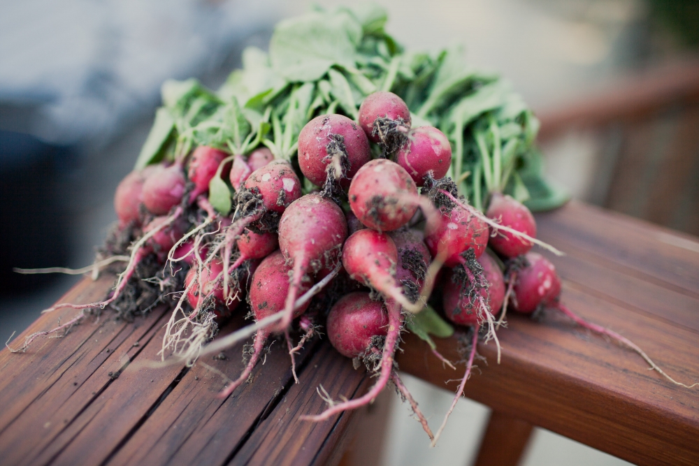 And we harvested a nice bunch of radishes. They're super spicy! Not sure what to do with the remainder of them. . .hmmm. . .This picture reminds me of a post over at Ngo Family Farm. "Is there dirt on your food? There should be."