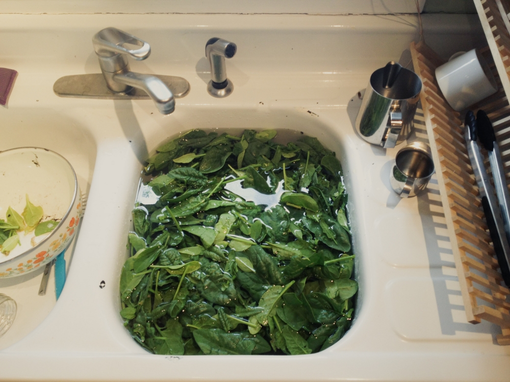 We got one good salad and a small batch of soup out of our spinach patch before we had some 90 degree weather a couple of weeks ago and it all bolted. We tasted it, and while it was too bitter for a raw salad, it should be fine in a lasagna. So we harvested the rest (a whole sink-full!) and wilted it down and froze it for later use.
