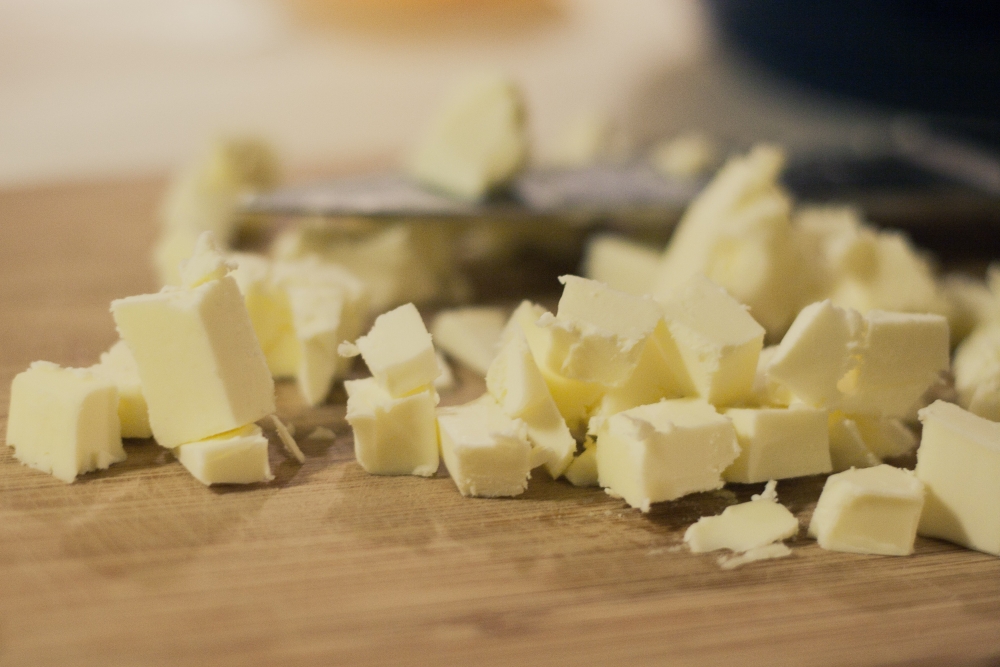 The crust is the same recipe as the pate brisee that is used for the apple blackberry pie. Cut the recipe in half, since you are only make a bottom crust. Start by whisking your dry ingredients together. Even though the recipe is cut in half, I accidentally still added a full tablespoon of sugar, but it resulted in a delicately sweet crust which was just amazing, so I highly recommend that extra bit of sugar. Chop your ice cold butter (or chop and freeze ahead of time). . .