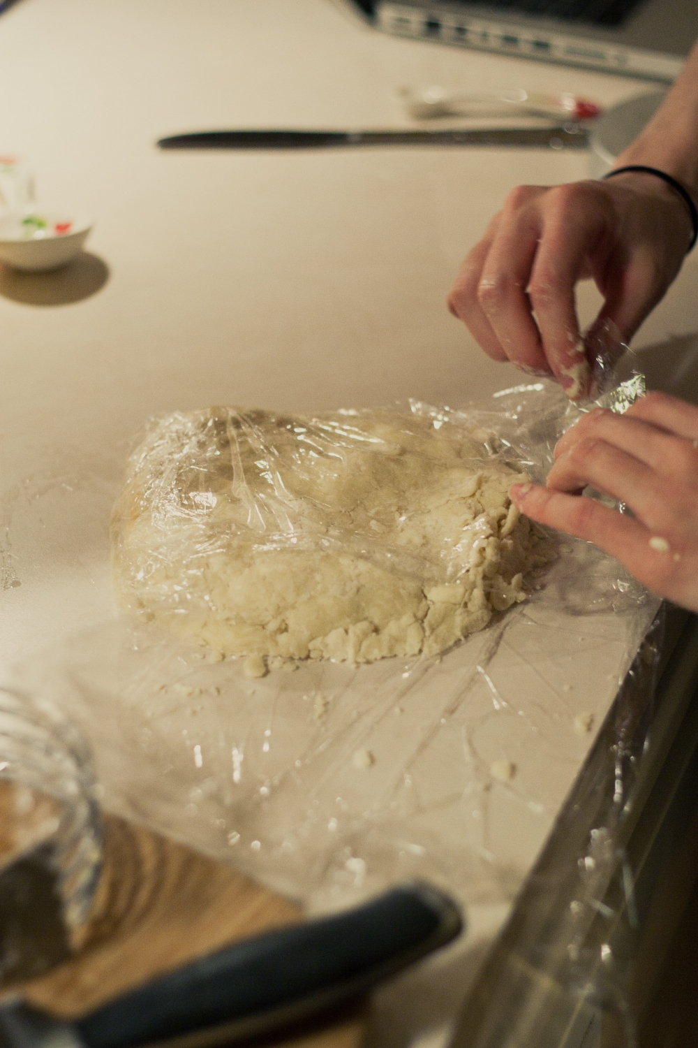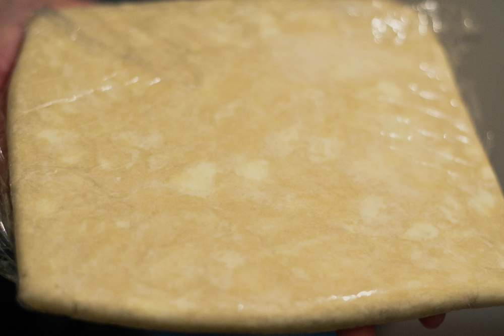 Sprinkle in water and mix until it holds together when pressed between two fingers. Don't overmix. Crumbly is good, and the moisture will spread through the crust while rolling and while it chills in the fridge. Press into a disk on a piece of plastic wrap and wrap up. . .