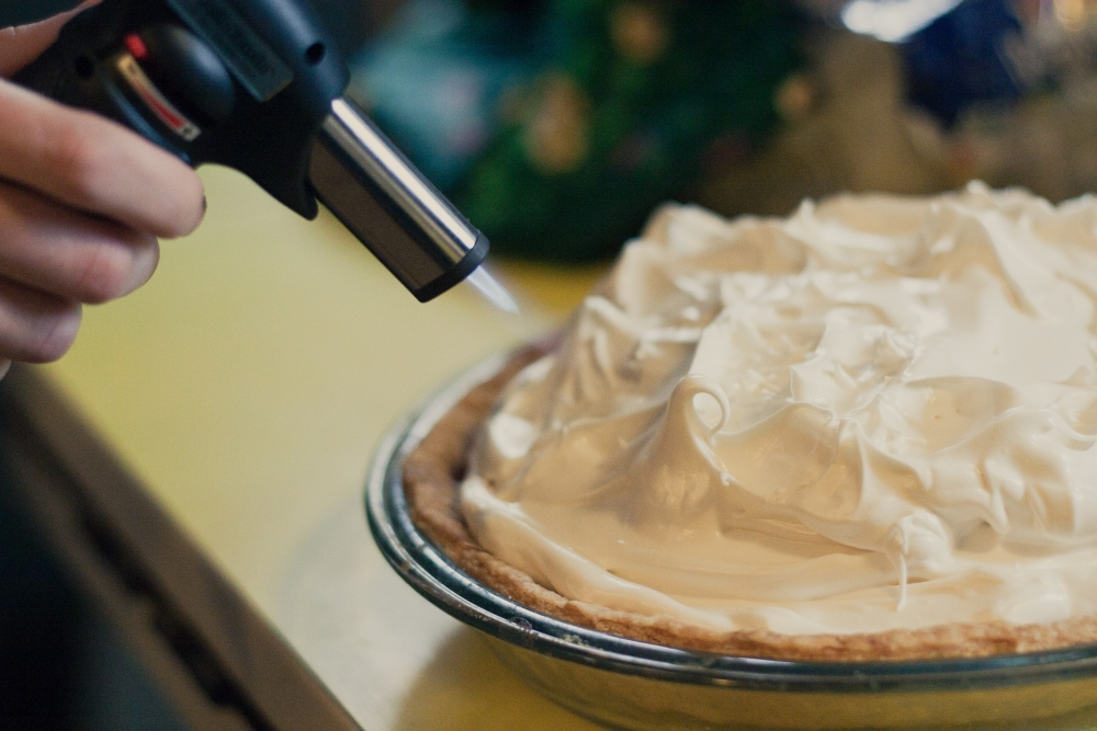 I bought a creme brulee torch at Marcel's just for this pie. At $30 it was worth it to me. But if you really don't want to buy a torch, you can brown it in the oven. About 2 minutes or until peaks are golden brown in a 450 degree oven should do it. I have never tried this method, so if you try it, let me know how it works. . .