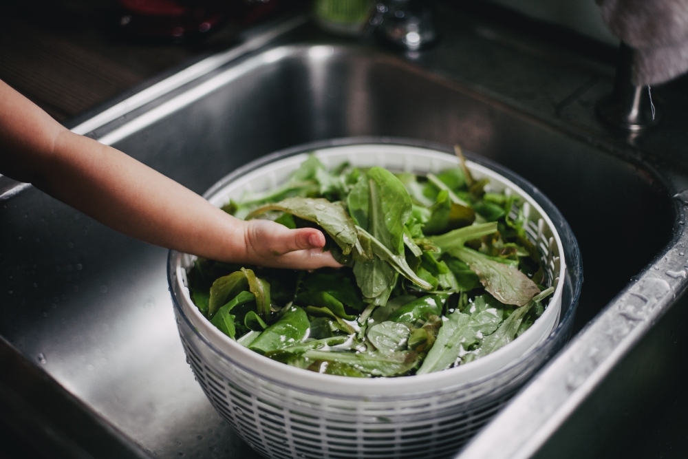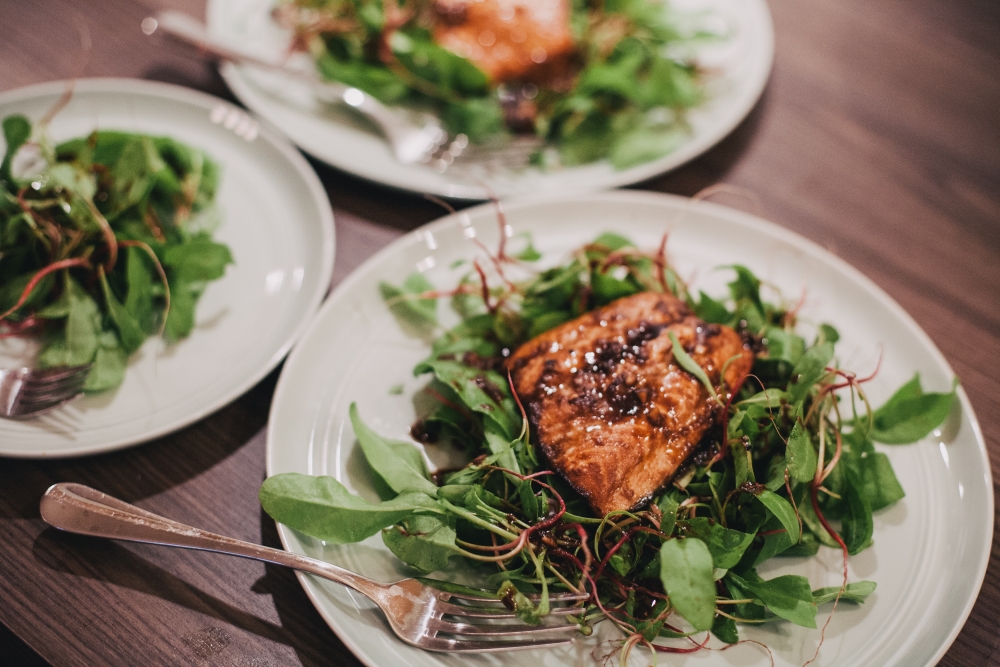 3. Soy and maple glazed salmon over beet thinnings from the fall garden