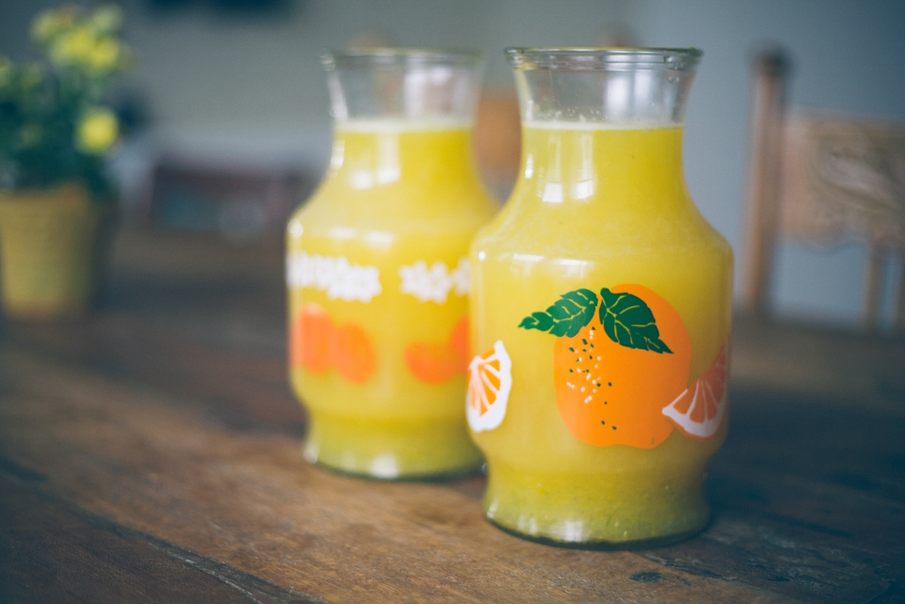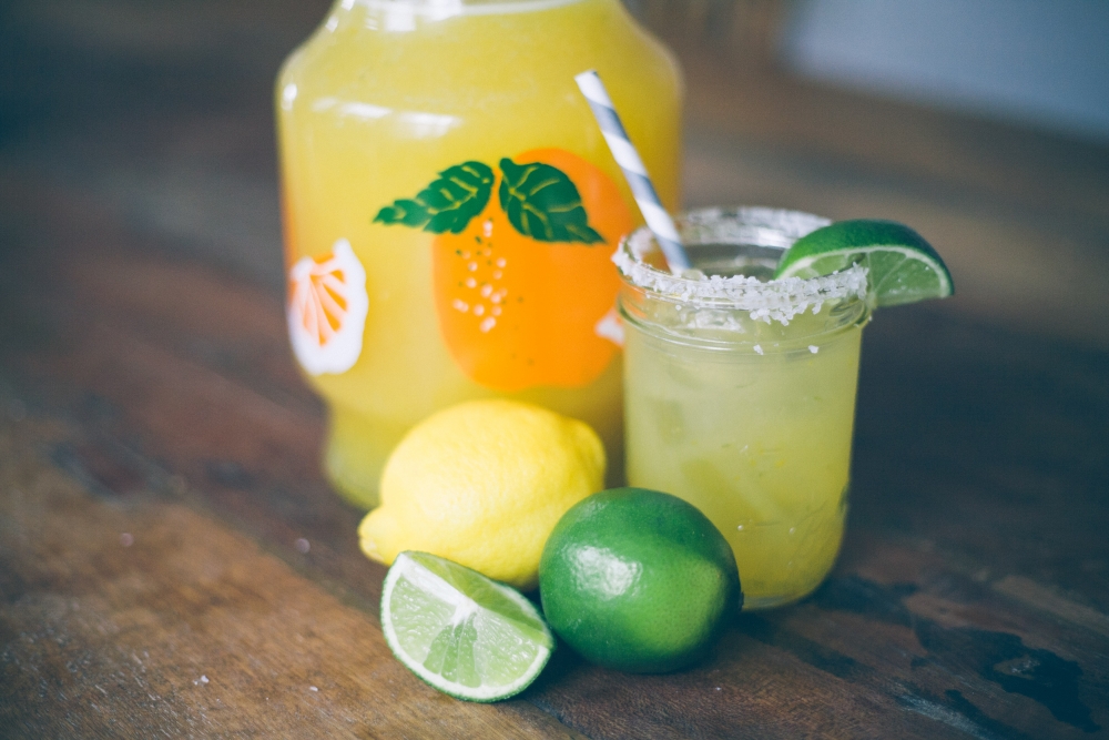 Once the syrup is cooled, combine it with the lemon, lime, and orange juices, and add 5-6 cups of water, depending on your desired strength (remember that pouring over ice will dilute it a little). This makes up to a gallon of margarita mix (which I split into two, two-quart containers).