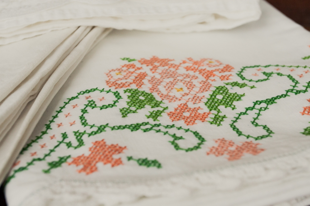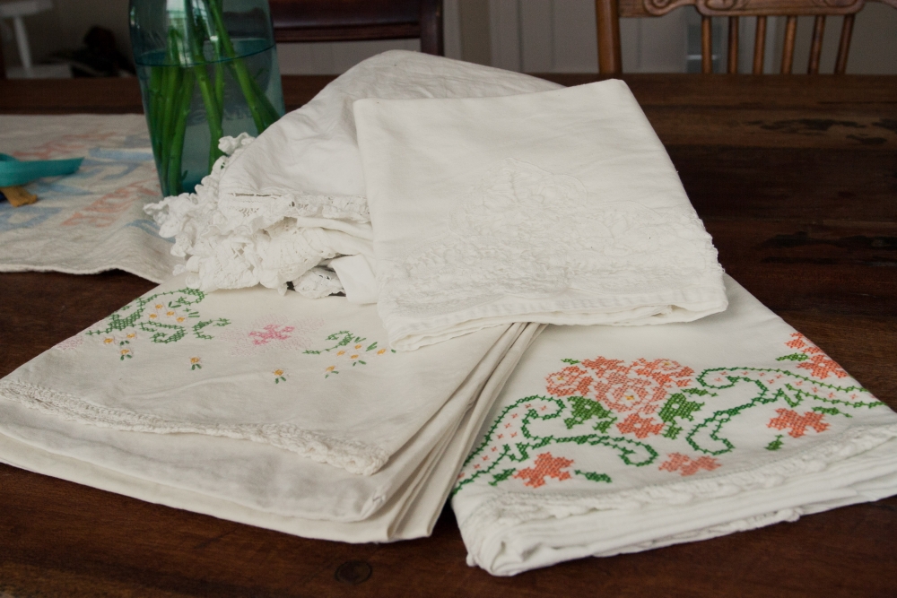 Back left: tape lace bedskirt; back right: tape lace pillowcase; front: beautiful cross-stitched pillow-cases.