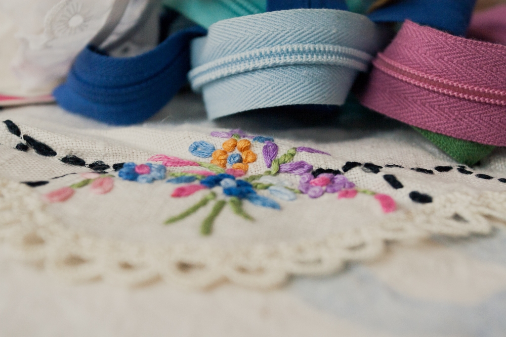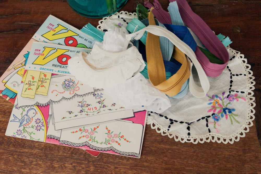 Vintage embroidery patterns, embroidered doily, and small stash of sewing notions (I'm trying to make a point of grabbing little sewing add-ons when I see them for cheap, because they're so expensive at the fabric store).