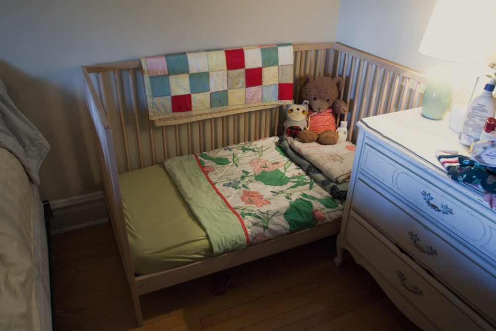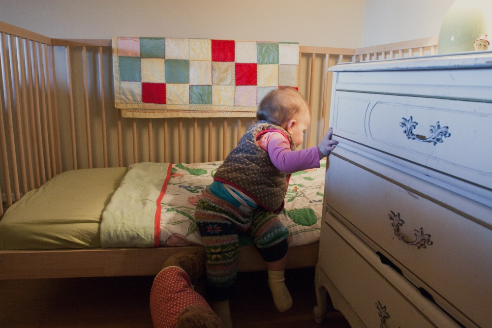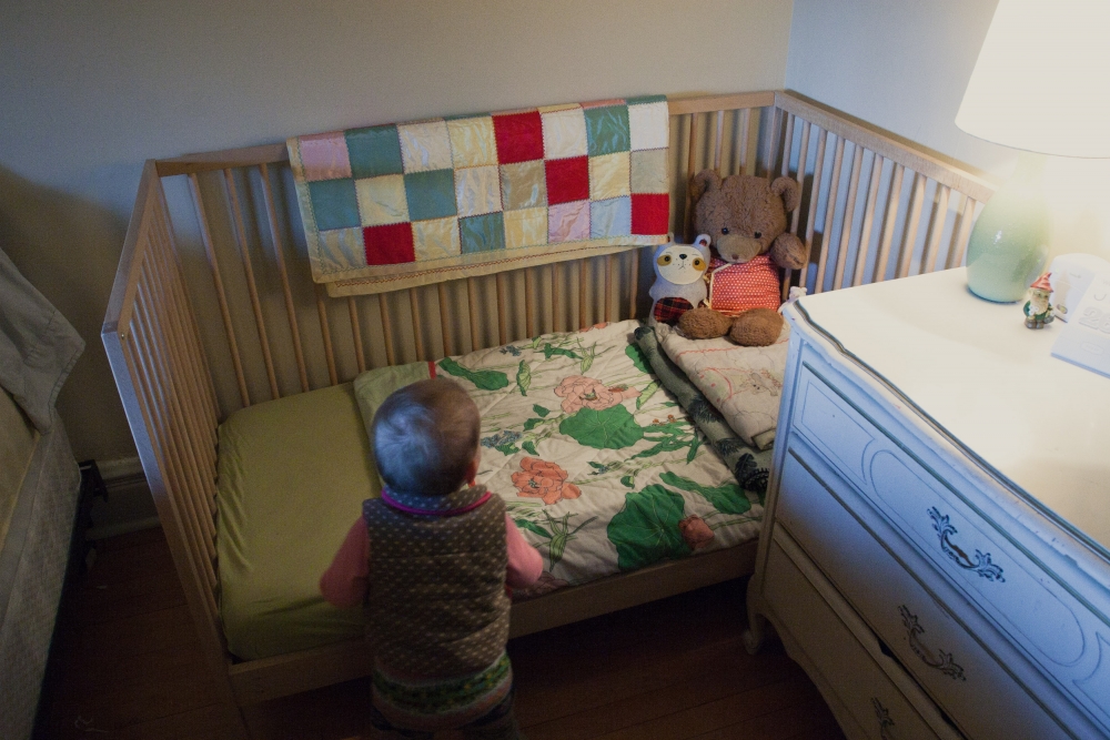 We never saw Indy's crib as a way to contain her; she's never been exiled there, and she's always been welcome in our bed. The sides are simply to keep her from rolling to her death (okay, okay, to her. . . bumps and bruises). But since she can now walk, and easily slide off the couches and even sometimes our tall bed (when she's feeling brave), we decided she has earned her liberty and we removed the side (p.s. if you're crib shopping I highly recommend our crib, which is the Sniglar from Ikea - it's simple and low profile, solid wood, has two height settings and easily converts to a toddler bed, and, best of all, its a whopping $69).