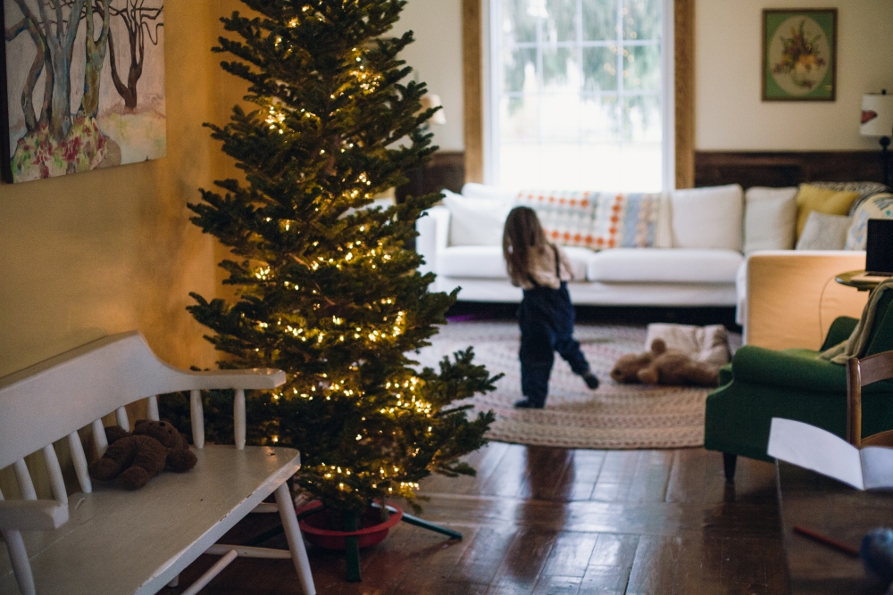 I didn't document the tree cutting this year. Honestly, it was a lot colder than I expected and the kids and I were rather under-dressed, so we hung out in the store while the tree-cutting was taking place. We set the tree up and strung the lights but we're leaving it otherwise undecorated until Christmas Eve. Some families who celebrate Advent will wait until that night before even putting their tree in the house, to magnify the sense of waiting, much like leaving the manger in the creche empty until Christmas. Then the tree stays up for all of Christmas (which really lasts until Epiphany, on January 6th!) I wasn't sure I could face a completely treeless Advent though, so I decided leaving the decorating until Christmas eve was a good middle ground. We're also doing a Jesse tree for the first time this year, and reading through this book by Ann Voskamp with Indy (we all really like it). It was my intention to use our real tree as our Jesse tree this year and to add one ornament each evening, but since I set out to make the ornaments myself and so far have only made 5 of 25, it looks like that part will have to wait until next Advent.