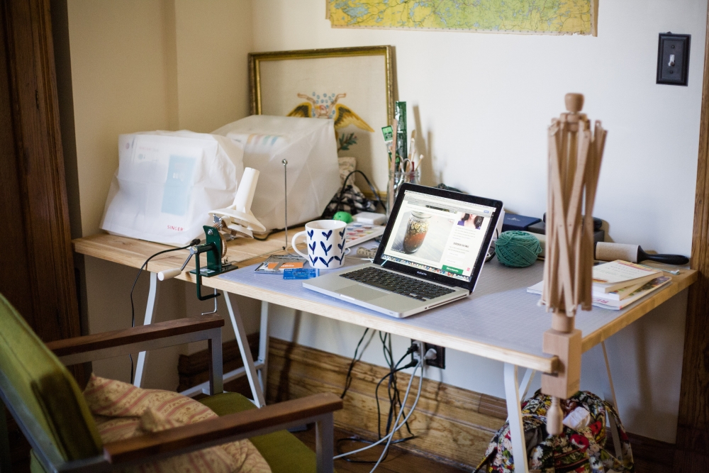 And that's my desk after being "cleaned". My interpretation is clearly a little loose, and after getting some new art supplies the other day it's now unphotographably messy. I think maybe I just need a bigger desk. Or two desks. Lord help me. (Also, Alan got me that yarn swift and winder for Christmas and they're wickedly fun!)