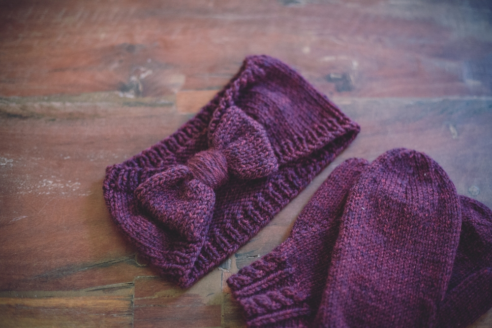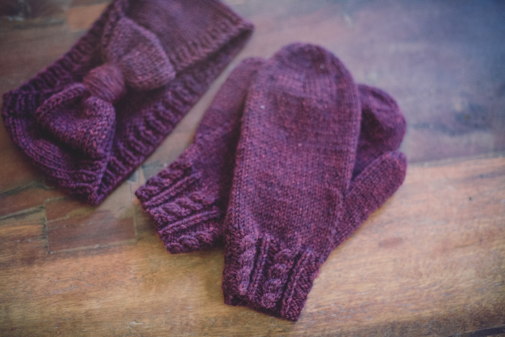 This headwarmer and mittens were for my sister. The mittens were my first time doing cables - fun! Mittens raveled here, bow head band here.